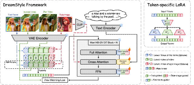 DreamStyle utilizes a self-built high-quality training dataset incorporating SDXL (Stability AI's open-source text-to-image framework), Seedream 4.0, and ControlNet (controllable image generation technology) to ensure accurate style transfer and motion coherence. Based on Alibaba's open-source Wan14B-I2V architecture, it introduces Token-specific LoRA technology to distinguish signals under different conditions and reduce semantic confusion.