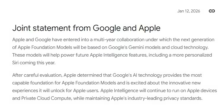 According to the joint statement issued by Apple and Google, the two companies will collaborate to drive the next generation of 'Apple-branded AI.' Apple's upcoming foundational AI model will be built on Google's Gemini and its cloud technology, supporting various Apple Intelligence features, including a new, personalized Siri.