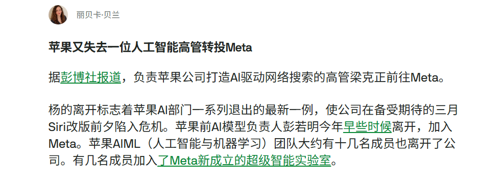 In recent years, Apple's AI executives and core engineers have been lured away by OpenAI, Google, and Meta in waves, with large numbers departing simultaneously. Even executives who have just been promoted to team leaders may find themselves in Meta's offices the next day.