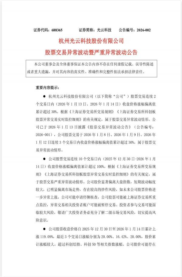 On the same day, Guangyun Technology issued an announcement stating that its stock price had experienced a cumulative deviation exceeding 100% in closing prices over ten consecutive trading days, significantly diverging from the overall market trend and constituting a scenario of severe abnormal fluctuation.