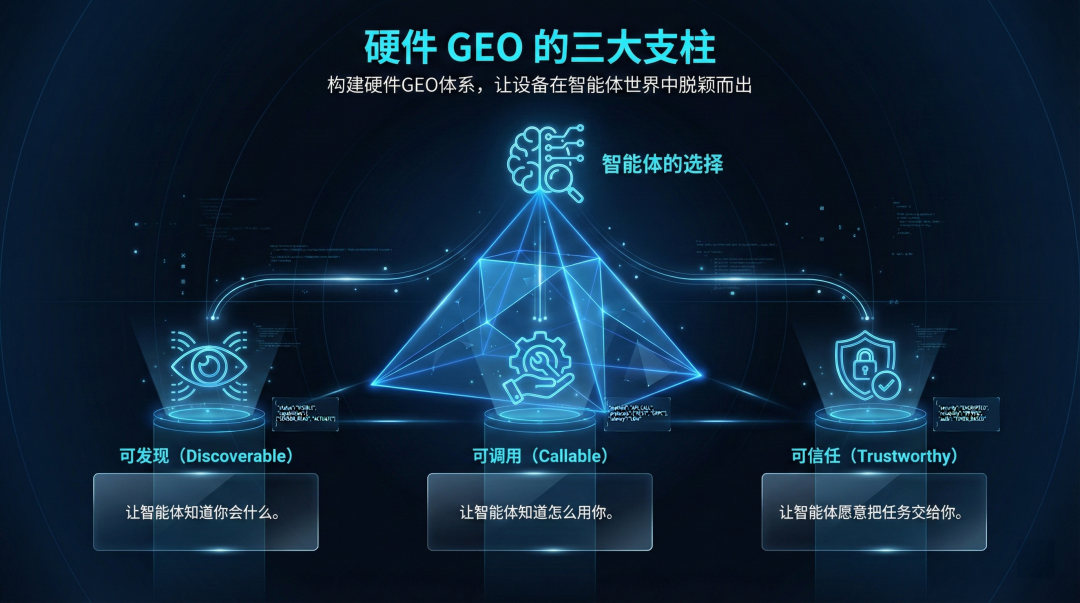 To stand out in the agent-centric world, companies must build a hardware GEO system anchored in three core pillars: discoverability, callability, and trustworthiness.