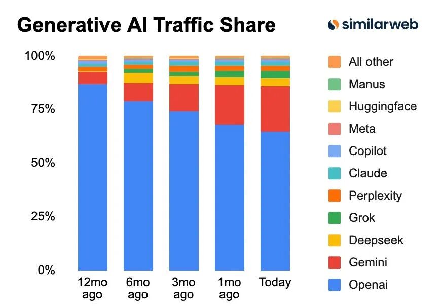 This means that one out of every five heavy AI users has migrated from other platforms (mainly ChatGPT) to Gemini.