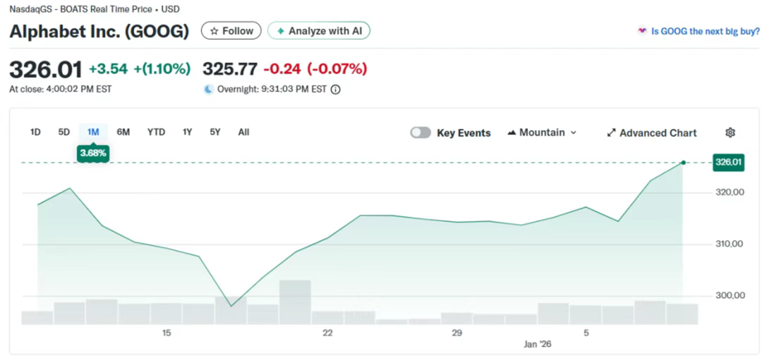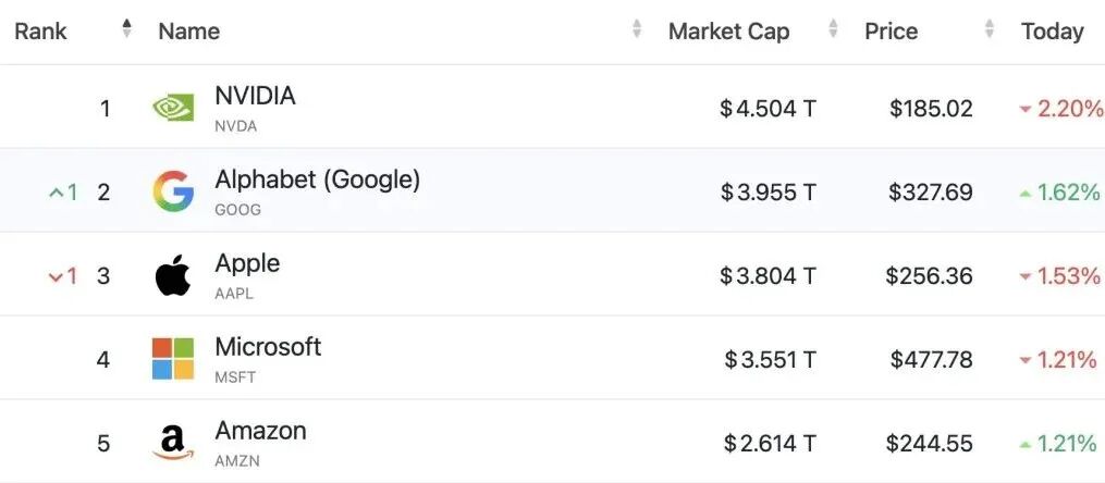 On Thursday of last week, Alphabet's lead over Apple widened further, with its stock price closing up 1.11% at $326 per share, hitting another all-time high intraday of $330.54 per share, and its total market value reaching $3.93 trillion, second only to NVIDIA's (NVDA) $4.50 trillion.