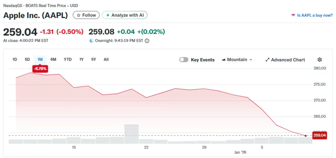 On the other hand, Apple's stock closed down 0.50% at $259.04 per share, dipping nearly 2% intraday to hit a new low in over two months, with its total market value shrinking to $3.81 trillion.