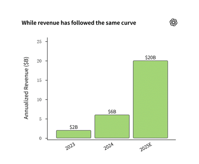 The widespread adoption of ChatGPT products has far surpassed official expectations, directly fueling unprecedented commercial growth: OpenAI's ARR soared from $2 billion in 2023 to $6 billion in 2024, surpassing $20 billion in 2025.