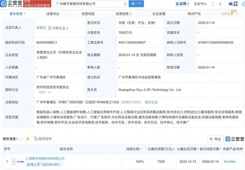 On January 14, Minimax registered "Guangzhou Xiyu Jizhi Technology Co., Ltd." in Huangpu District, Guangzhou, through its affiliated company "Shanghai Xiyu Jizhi Technology Co., Ltd.," with a registered capital of RMB 70 million. Its business scope encompasses intelligent robot sales, AI hardware and application software development, and industry system integration services, indicating its acceleration from large model R&D to integrated software-hardware and industry deployment.