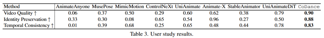 To quantify perceptual quality, this paper conducted a comprehensive user study. The study involved paired A/B preference tests administered to 10 participants. Using 20 different identities and 20 driving videos, we generated 20 animations from each of the 9 evaluation methods. In each trial, participants were shown two side-by-side videos generated by different methods and asked to select the better result based on three criteria: (1) video quality, (2) identity preservation, and (3) temporal consistency. As summarized in Table 3, CoDance achieved the highest preference rates across all three criteria, demonstrating its clear perceptual advantage. Specific data are as follows: