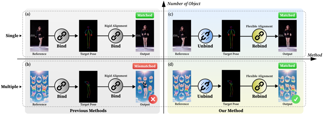 As shown in Figure 2, previous methods typically enforced rigid spatial bindings between reference images and target poses. This paradigm generates correct results in single-person animation as long as human-like reference images spatially align with target poses. However, they are limited by mismatched scenarios, such as differing numbers of subjects between reference images and target poses. Due to reliance on rigid spatial alignment, models fail to correctly animate subjects in reference images. Instead, they hallucinate new, pose-aligned individuals in corresponding spatial regions. To overcome this fundamental limitation, this paper proposes a novel paradigm: Unbind-Rebind, which breaks forced spatial alignment caused by input mismatches and re-establishes correct correspondences between motions and identities.