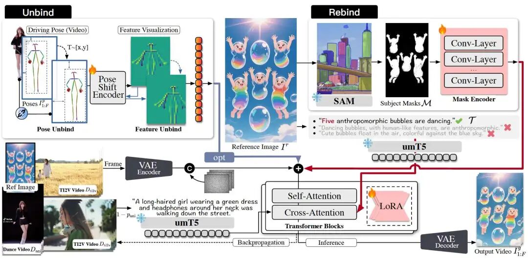 Semantic Rebinding: Introduces a text branch, utilizing a mixed-data training strategy (joint training on animation data and large-scale text-to-video data) to explicitly specify subject identities and quantities through text prompts.
