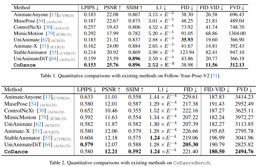 SOTA Performance: Achieves SOTA performance across all metrics on both CoDanceBench and the existing Follow-Your-Pose-V2 benchmark, demonstrating strong generalization capabilities.