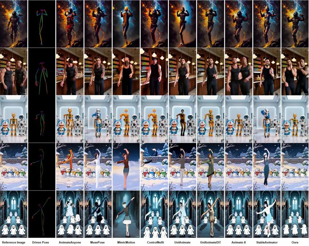 Quantitative Metric Improvements: Significantly outperforms SOTA methods like MagicAnimate, Animate Anyone, and UniAnimate in video quality, identity preservation, and temporal consistency.