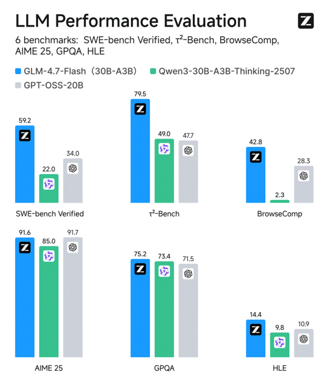 In multiple tests, GLM-4.7-Flash outperformed two current mainstream lightweight open-source models, leading in six out of seven benchmarks, including the programming evaluation standard SWE-Bench. It excels in practical scenarios such as programming, Chinese writing, translation, long-text comprehension, and role-playing.