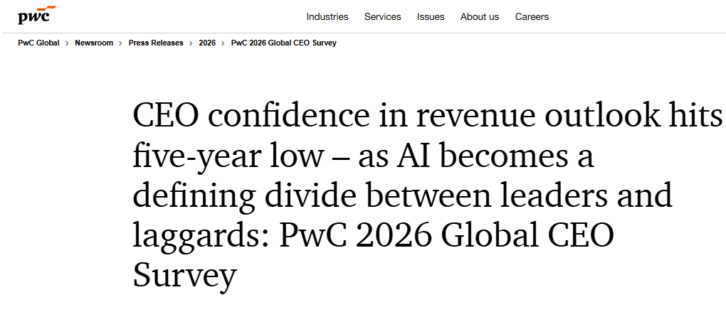 PwC's survey reveals that only 30% of global CEOs are optimistic about revenue growth in 2026, marking a new low in recent years. The attitude of CEOs towards AI has shifted from 'investing at any cost' to 'cautiously assessing outcomes'.