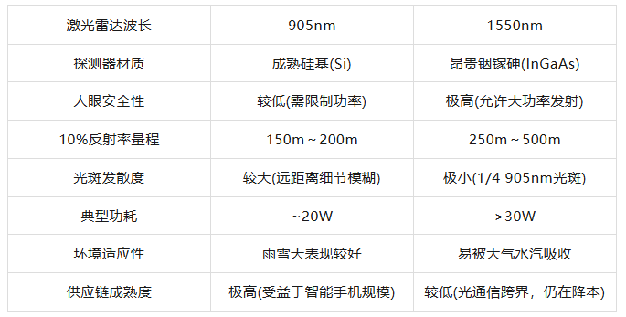 Another technological variable in LiDAR is wavelength selection. Currently, there are two mainstream wavelengths for LiDAR on the market: 905nm and 1550nm. The 905nm wavelength has a significant cost advantage due to its compatibility with mature silicon-based receivers, but it is strictly limited by human eye safety power constraints, posing a natural 'ceiling' when increasing line counts and detection range.