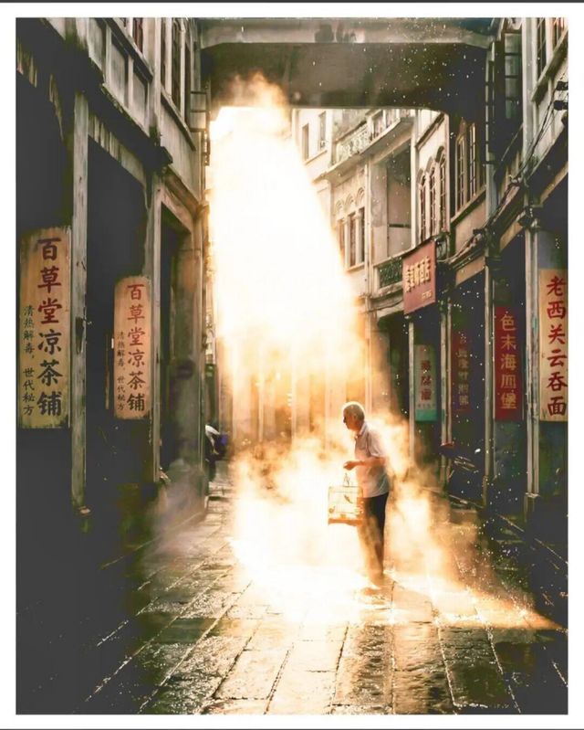 Initially, everyone was moved by this old photo's unique texture. The warm yellow tones created a nostalgic atmosphere, the composition was steady, and light leaking from building shadows carved rich layers on aged structures. An elderly man carrying a birdcage in the foreground seemed to narrate the street's leisurely pace.