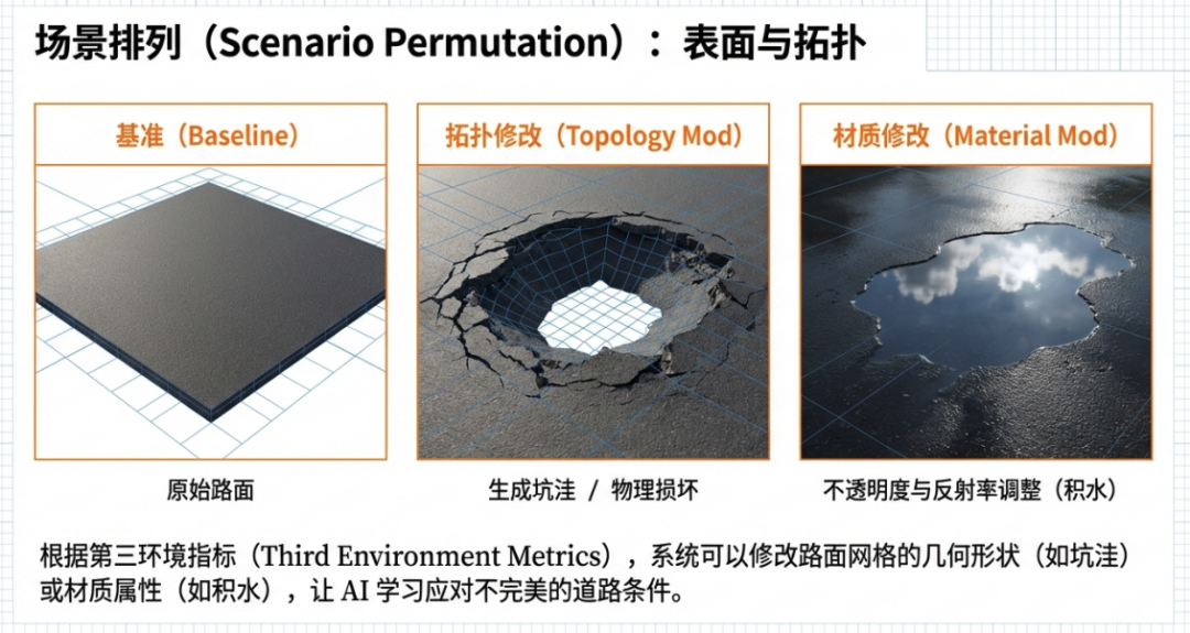 Breaking free from real-world constraints (God's perspective): It can freely modify the environment in the virtual world. For instance, it can generate blizzard conditions on a tropical map or create potholes and standing water on flat roads using algorithms.