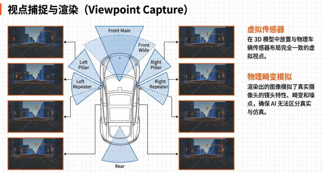 The above creates the ever-changing scenarios often seen in world models. However, our autonomous driving perception is primarily based on data input from 8-11 cameras. Therefore, it is necessary to convert the world model's videos into the input format of these 8-11 cameras. Thus, Tesla proposes the concept of virtual viewpoint rendering. The system places virtual cameras in the 3D world, with positions, angles, and fields of view identical to those of the hardware on real vehicles (front, side, rear views, etc.), generating dozens of parallel simulated video streams.