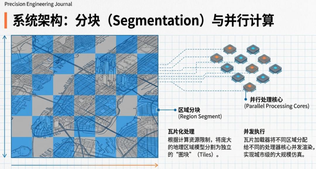 Immense computational power consumption: To generate high-fidelity 3D environments and realistic lighting effects (such as road reflections and dynamic weather), the system requires extremely high computational resources. The patent specifically mentions the need to divide maps into small sections (Tiling) and assign them to different processors for parallel computing to address this issue.