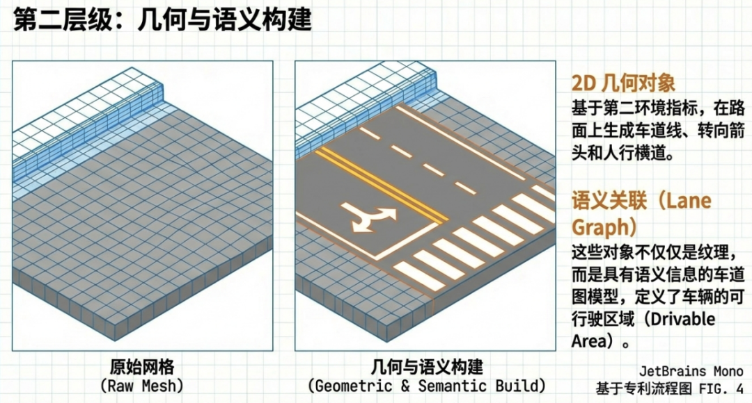 2D Geometric Objects Mapping: On top of the First Surface, the system generates 2D objects based on 'second environmental indicators.' These objects include lane lines, directional arrows, and other road markings. Technically, these are textures or planar objects fitted onto the 3D mesh surface.