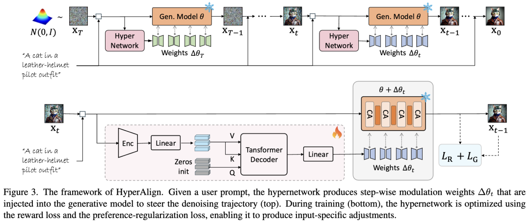 Hypernetwork as a Dynamic LoRA Predictor: Our goal is to learn a hypernetwork that takes and as inputs and outputs adjustments for each step of the generative process. A naive approach would involve learning an alignment score to replace Equation (6), but this requires a formula similar to the original generative score, resulting in high complexity. Instead, we design the hypernetwork to directly adjust the score corresponding to network parameters in the original generative model, specifically by generating a lightweight low-rank adapter (LoRA) for .