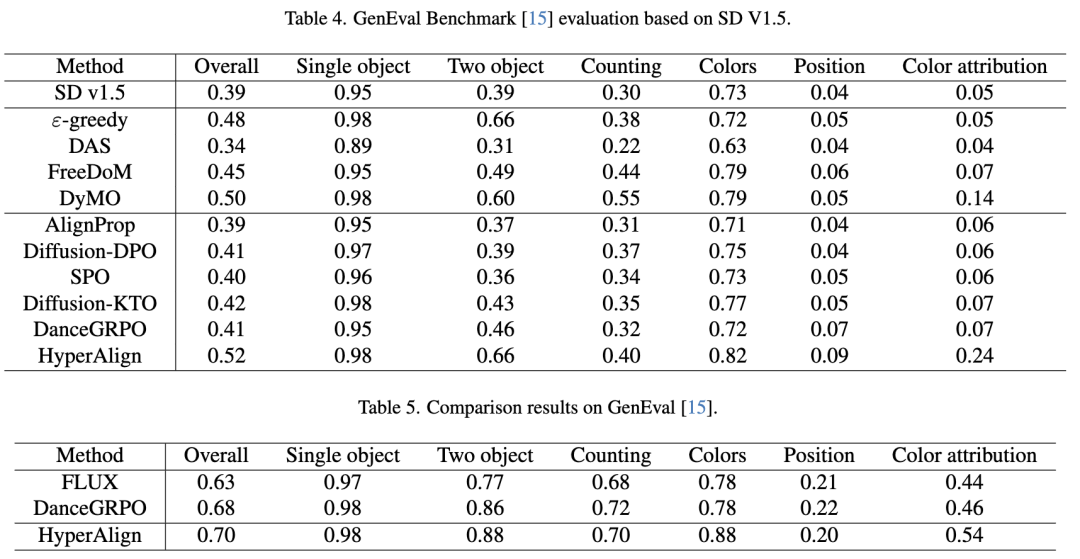 GenEval Benchmark: HyperAlign excelled in fine-grained metrics such as object synthesis and attribute binding (as shown in Tables 4 and 5 below).