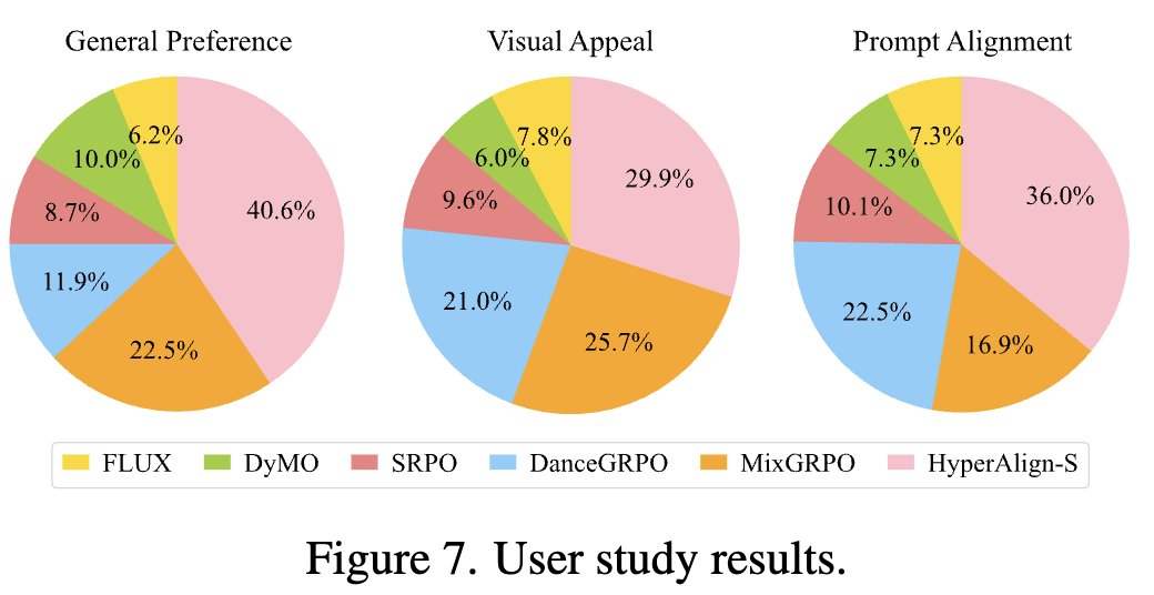 In a user study targeting the FLUX model, 100 participants voted on three dimensions (overall preference, visual appeal, prompt alignment). HyperAlign-S achieved the highest user approval ratings across all dimensions, significantly outperforming methods such as DyMO, SRPO, and MixGRPO.