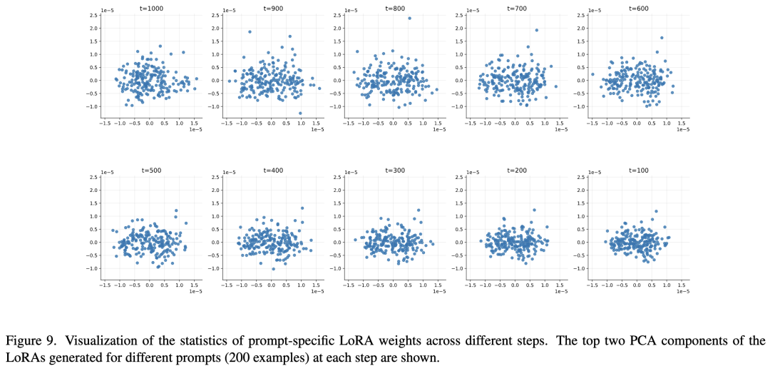 Diversity: PCA analysis demonstrated that HyperAlign generated unique LoRA weights for different prompts, particularly in the early generation stages (as shown in Figure 9 below).