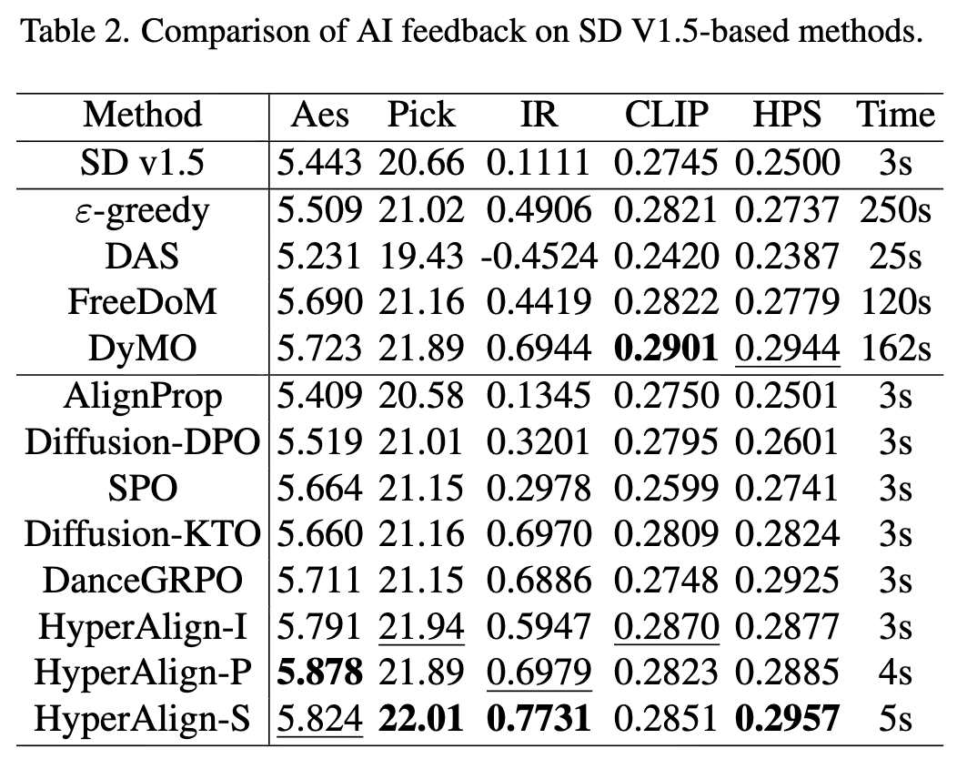 HyperAlign effectively achieved alignment, with HyperAlign-S (per-step adjustment) performing optimally, while HyperAlign-I (initial step only) and HyperAlign-P (segmented steps) offered faster inference speeds while remaining competitive.
