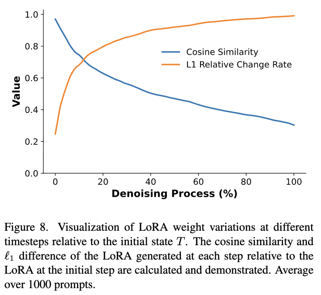 LoRA Weight Dynamics: Analysis revealed that as the denoising process progressed, the cosine similarity between generated LoRA weights and initial weights decreased, while the