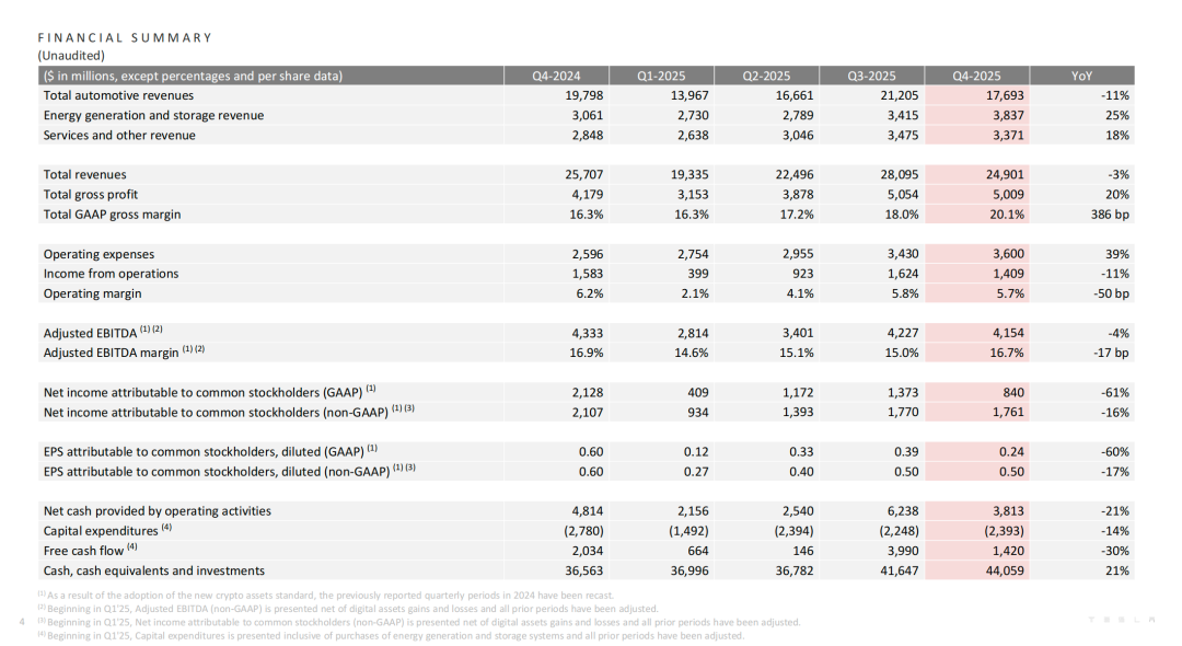 Early this morning, Tesla released its Q4 2025 financial report, revealing dismal data: revenue of $24.901 billion, down 3% year-on-year; GAAP net profit of only $840 million, a staggering 61% plunge year-on-year.
