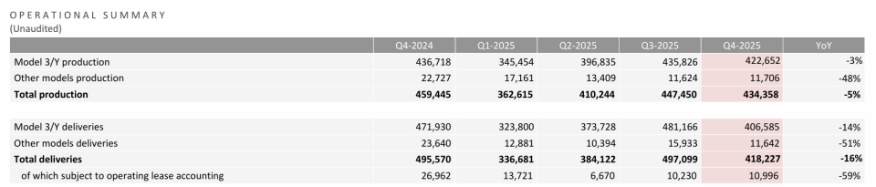 In Q4 2025, Tesla delivered 418,000 vehicles globally, down 16% year-on-year. For the full year, cumulative deliveries were 1.636 million, down 8.6% year-on-year. This marks Tesla's first-ever annual delivery decline, with BYD seizing the global electric vehicle sales crown.