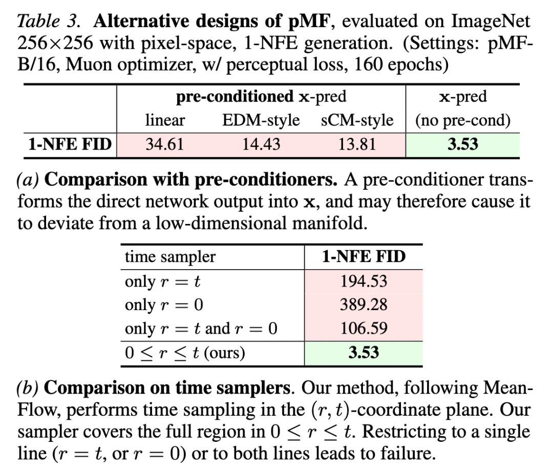 Alternative: Pre-conditioner: This study compares three pre-conditioner variants: (i) linear; (ii) EDM style; (iii) sCM style. Table 3a reveals that while EDM and sCM styles outperform the naive linear variant, simple -prediction is more preferable and performs better in the extremely high-dimensional input regime considered in this study. This is because unless , the network prediction diverges from the space and may reside on a higher-dimensional manifold.