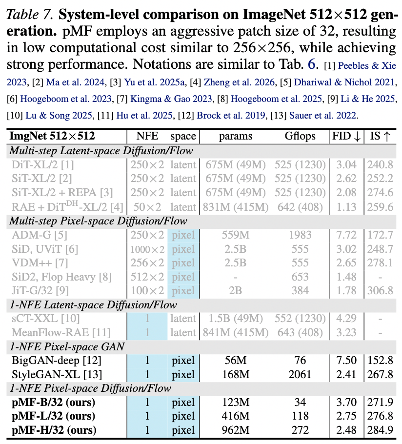 These results indicate that one-step pixel-level generation models have become highly competitive while eliminating the need for additional decoder overhead (which accounts for significant computational costs in latent space models).