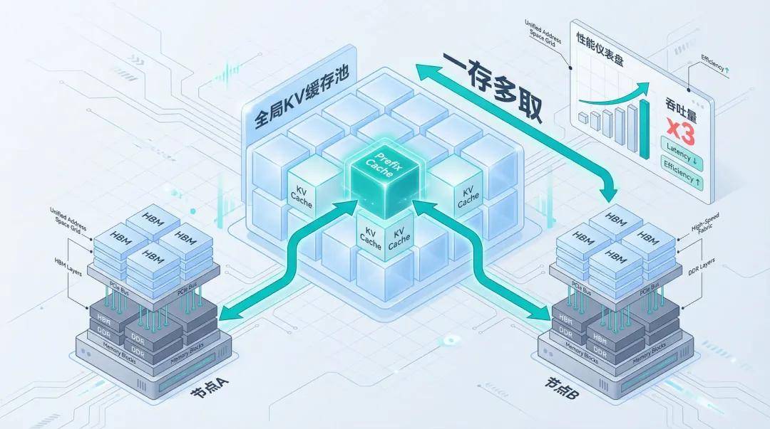 With unified memory addressing, KV Cache can be globally pooled and support Prefix Cache reuse. For example, 'System Prompt' is usually fixed and only needs to be stored once in global memory, allowing all nodes to read it directly through a 'one-store, multiple-retrieve' approach. When the PreFix Cache hit rate reaches 100%, cluster throughput performance can improve by threefold.