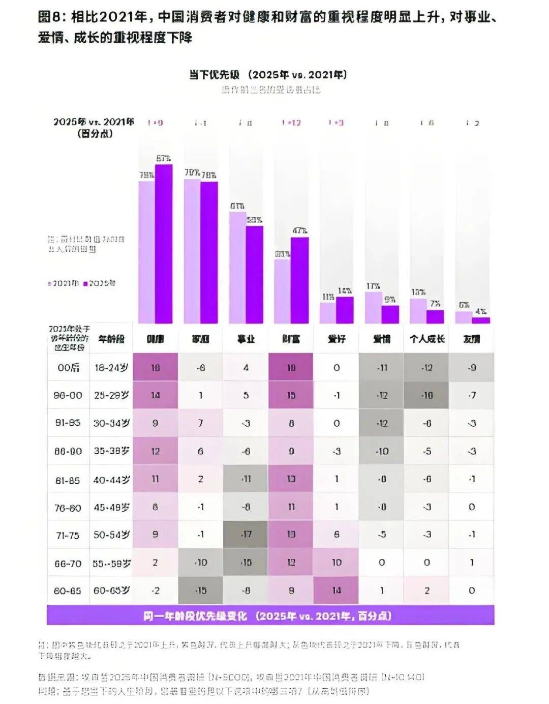 An Accenture survey reveals that compared to 2021, Chinese consumers are increasingly prioritizing health and wealth. Virtually every demographic has shifted its focus, placing "wealth" and "health" at the forefront. In 2025, 87% of consumers prioritized health (up 9 percentage points from 2021), and 47% prioritized wealth (up 12 percentage points).
