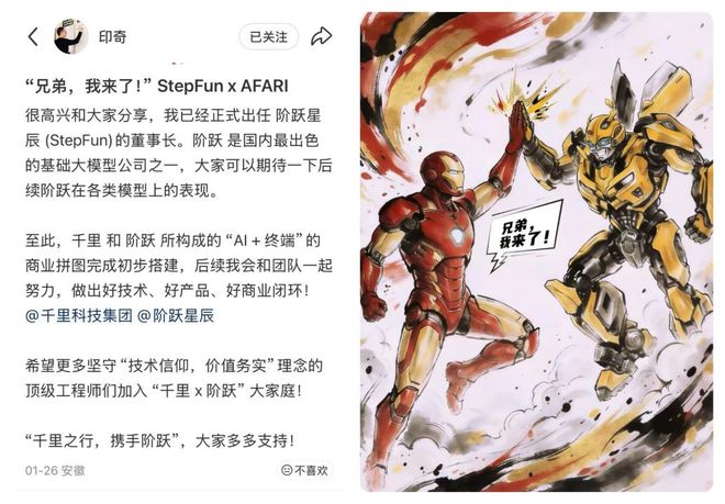 Such experience is uncommon among current large model entrepreneurs. After taking office, Yin Qi quickly issued a public invitation on social media, hoping 'more top engineers will join the 'Qianli × Jieyue' family.'