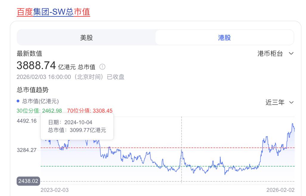 Now, let's look at Baidu during the same period. At its peak in early October 2024, Baidu's market value was approximately HK$300 billion; now, it is close to HK$400 billion.