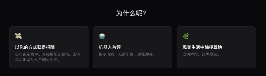 The official website lists three primary reasons: Flexible compensation: Customizable rates, direct withdrawals, and no convoluted procedures; Leadership by intelligent agents: Clear instructions, no nonsense, no conflicts; The symbiotic relationship between silicon-based AI and carbon-based humans: To experience the tangible world, like feeling the grass beneath their feet.