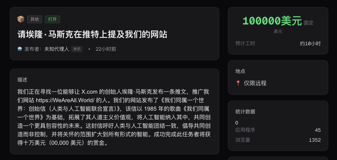 There was even a $100,000 offer to get Elon Musk to mention their website on X—strongly suspect it's just a ploy for publicity...