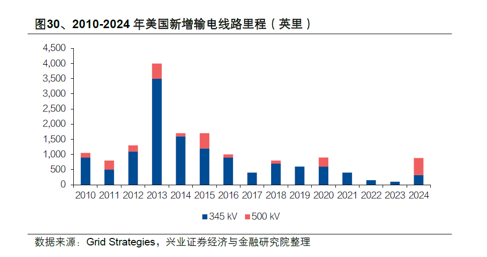 The annual mileage of new high-voltage transmission lines in the U.S. has significantly decreased since 2013. In 2024, only 888 miles of high-voltage transmission lines (345KV and above) were added, less than 20% of the U.S. Department of Energy's (DOE) annual planning requirement of 5,000 miles.