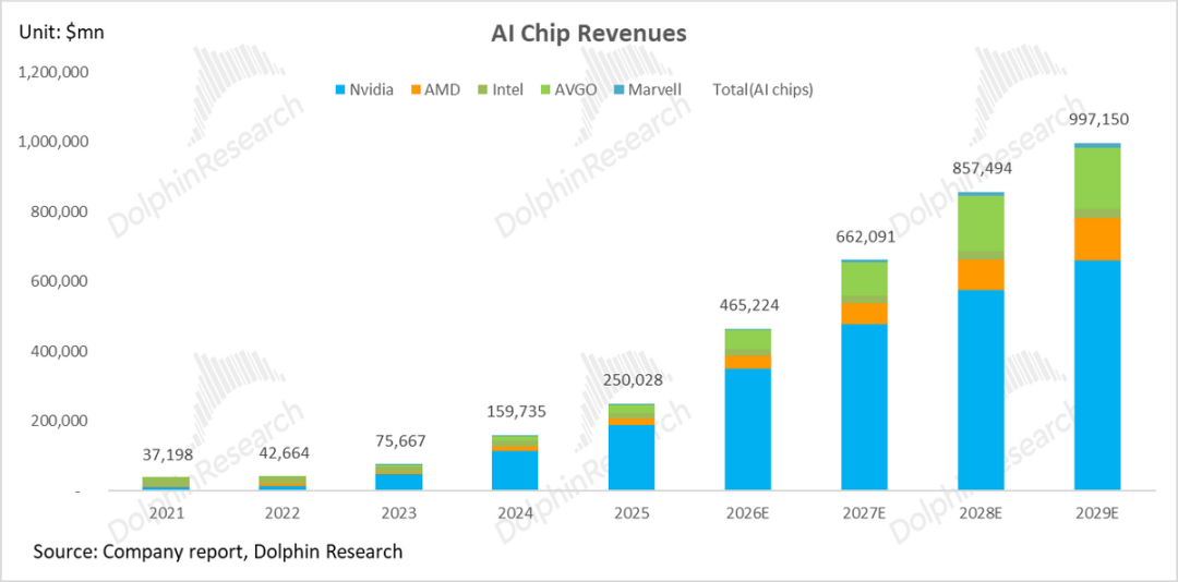 According to Jensen Huang, the construction cost of a 1 GW data center capacity is approximately USD 50-60 billion (including approximately USD 35 billion for the chip system). Dolphin Research takes the median value of USD 55 billion/GW (assuming all data centers use NVIDIA chips).