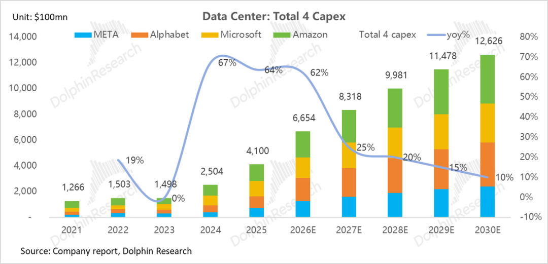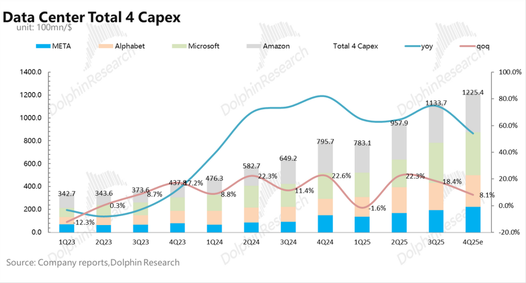 Represented by Amazon, Microsoft, Google, and Meta, the capital expenditures of the four major North American CSPs have entered a 'arms race' mode since H2 2023. Their total CapEx has surged from approximately $150 billion in 2023 to an estimated $406 billion in 2025 (CAGR exceeding 60%).