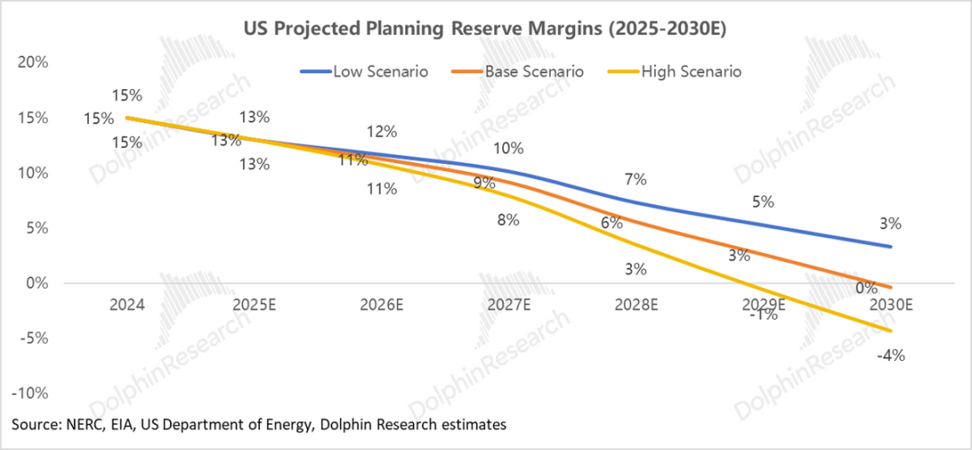 Assuming the system reserve margin remains the same as in 2024 (15%), and considering the explosive growth in AI-related load on the demand side, Dolphin Research predicts that by 2030, the U.S. power system will face a significant reliability shortfall. The estimated gaps under low, medium, and high-demand scenarios are expected to reach 109GW, 149GW, and 195GW, respectively.
