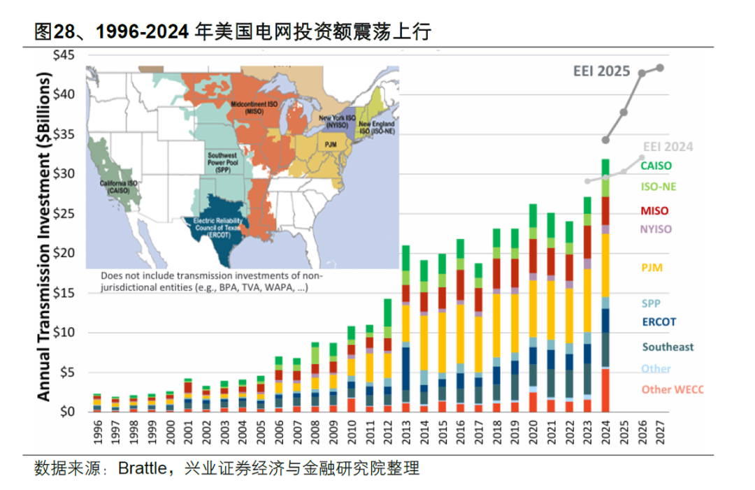 Due to slow growth in U.S. electricity consumption after 2000, the hollowing-out of the domestic power equipment manufacturing industry (with key components such as transformers highly dependent on imports and facing a shortage of skilled technicians), and the fragmented ownership of the U.S. grid (primarily privately owned), grid investment in the U.S. has remained at a low level for a long time (averaging about $20-30 billion annually over the past decade, only surpassing $30 billion in 2024).