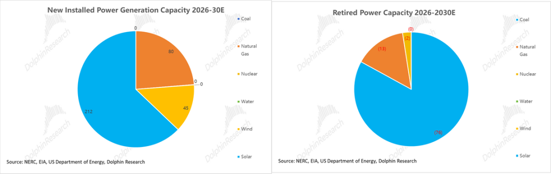 Based on the planning guidelines from the EIA, NERC, and the U.S. Department of Energy, Dolphin Research has made the following forecasts for the new supply of power generation energy over the next five years (2026-2030E):