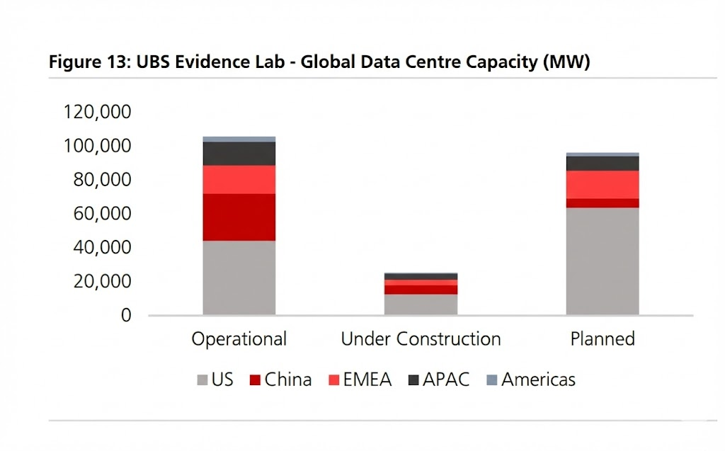 According to UBS data, by the end of 2025, the global operational capacity of data centers will be 105 GW, with 25 GW under construction and over 100 GW in the planning phase.