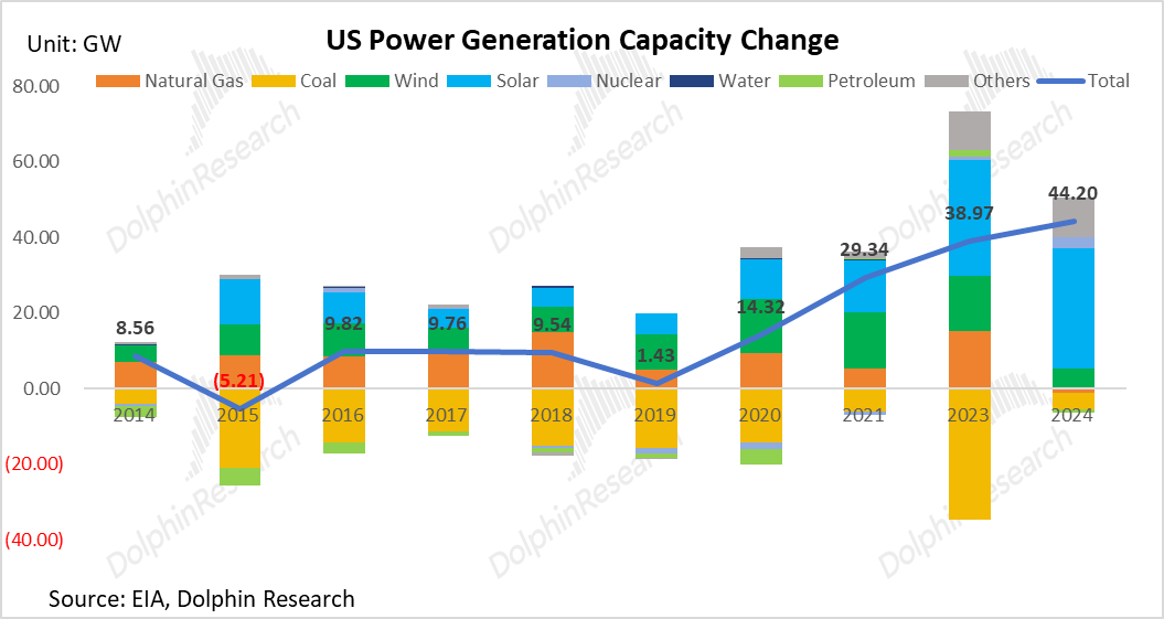 Furthermore, due to the significant differences in the reliable output (effective capacity) contributions of different power sources during peak grid demand periods, Dolphin Research has adjusted the aforementioned net increase of 245GW of installed capacity based on effective capacity factors (90%/90%/95%/80%/40%/10% for coal/gas/nuclear/hydro/wind/solar, respectively). The result shows that the new effective net capacity added to the U.S. power system over the next five years will only be about 28GW.