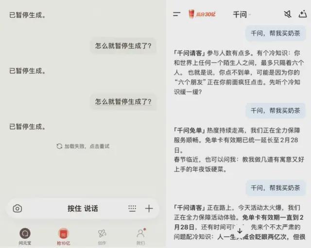On February 1, the Tencent Yuanbao App launched a 1 billion yuan red packet campaign for the Spring Festival. When users attempted to use features such as "Spring Festival Template to Create Similar Content," they frequently encountered prompts stating "Generation Temporarily Suspended," indicating brief service instability. Similarly, on February 6, Alibaba's Qianwen App experienced multiple instances of lag during its "3 billion yuan in free orders for the Spring Festival" campaign due to a massive influx of traffic, preventing users from completing orders, payments, and sharing.