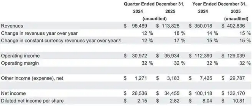 Looking at the full year of 2025, Google's total revenue reached $402.8 billion, up 15% year-over-year, making it the first tech company in history to surpass $400 billion in annual revenue. In terms of net profit, Google's 2025 net profit reached $132.17 billion, up 32% year-over-year, primarily driven by the implementation of AI technology and the rapid expansion of Google Cloud.