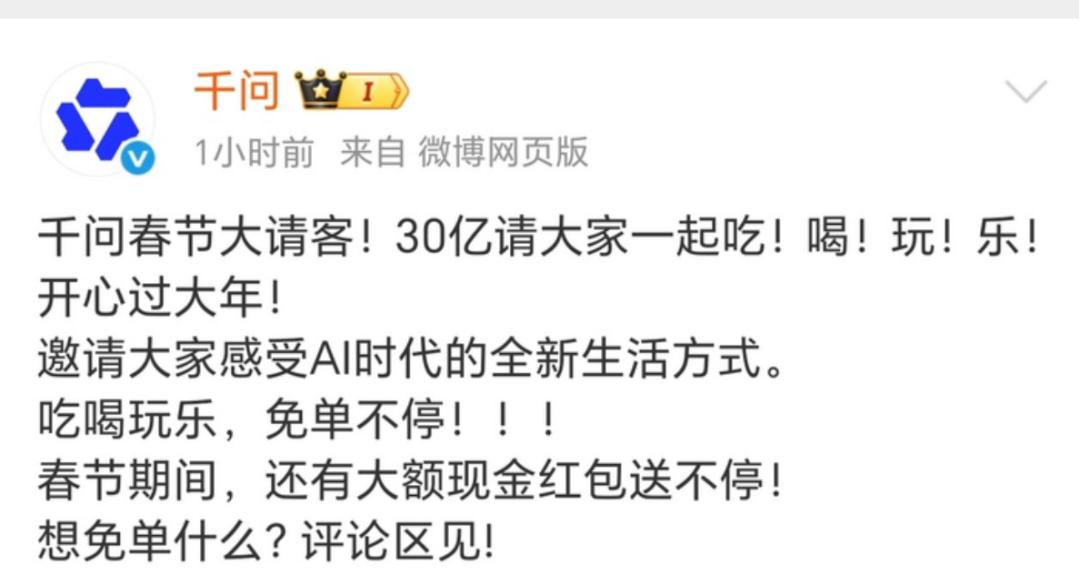 Alibaba similarly targeted user life scenarios. Its Qianwen AI launched a “3 billion yuan free order” campaign during the festival, incentivizing users to access Alibaba apps like Taobao Deals and Fliggy via Qianwen for tasks like ordering food or booking hotels.